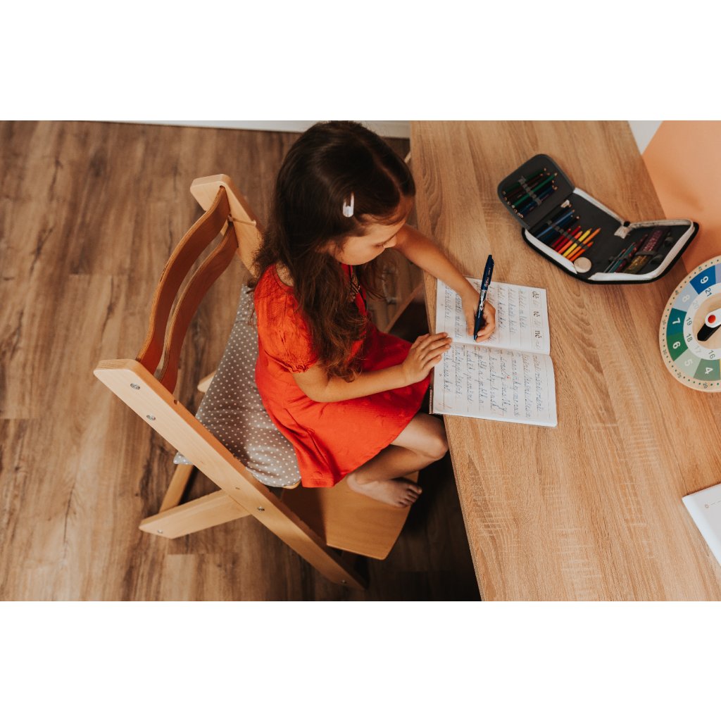 Židle posedo není sériovka z pásu. Každý kus vzniká v naší české dílně, kde ruce zkušených řemeslníků dbají na každý detail – od precizního tvarování po finální povrch. Používáme odolné, zdravotně nezávadné materiály, které něco vydrží a snadno se čistí. Rovný sedák pomáhá udržet přirozené držení těla a podporuje zdravou pozici páteře při každodenním sezení u stolu. Nastavitelná výška sedáku i podnožky zajistí, že se dítěti židle vždy přizpůsobí – ne naopak. A když chcete, přidáme stoleček nebo na židli vygravírujeme jméno. Protože každé dítě je jedinečné.